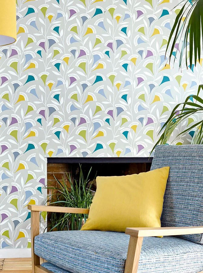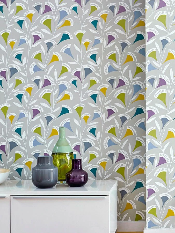 Vintage Art auf neue Art. Design Tapete Ambira entscheidet sich für gedeckte bunte Farben, die mit dem hellolivgrauen Untergrund perfekt korrespondieren. Die stilisierten Blumenranken strecken sich in alle Richtungen, wie von einem Windzug berührt. Diese hochwertige Vliestapete weckt schnittige Lebensfreude.