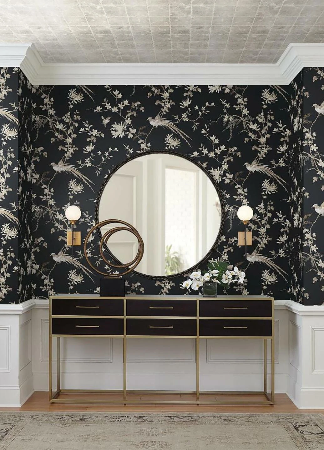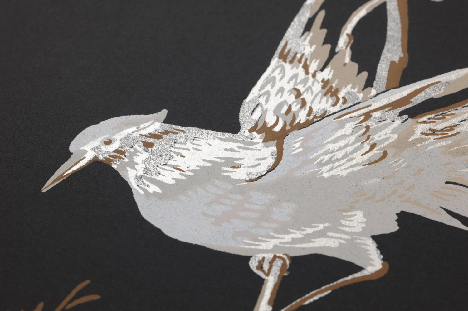 Helle, zarte Musterfarben mit einem leichten Schimmer auf dem matten schwarzen Untergrund verleihen Coringa ein edles Äußeres. Die anmutigen Vögel mit ihren langen Schwanzfedern und die Zweige voller Blätter und Blüten bringen den orientalischen Stil in seiner absoluten Luxus-Ausführung zu Ihnen nach Hause. Besonders kostbar wirkt die Tapete durch den Farbauftrag im Leimdruckverfahren mit seinem Charme traditionellen Handwerks.