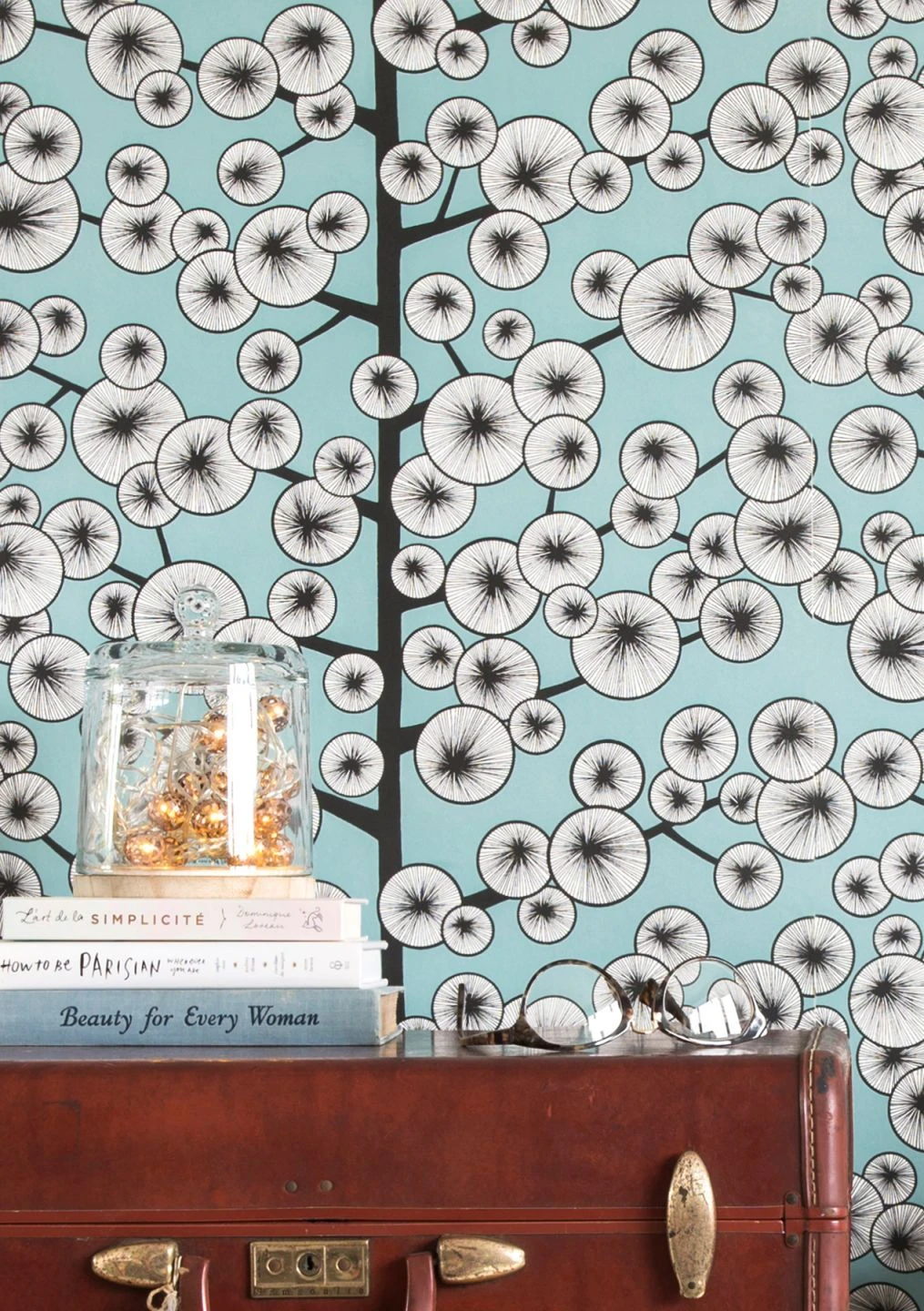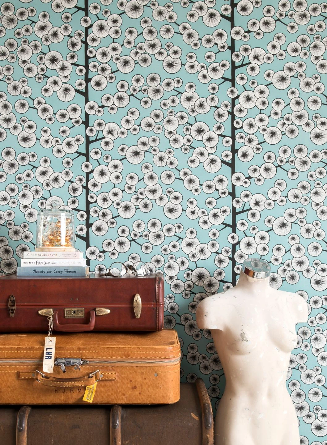 Die Vliestapete empfindet den besonderen Charakter der Baumwollpflanze nach. Durch schraffierte Kreise deutet sie die weichen, federleichten Baumwollbüschel an, mit denen die Pflanzen zur Erntezeit übersät sind. Die stilisierten Büschel wirken durch die Zeichentechnik dreidimensional, so als könnte man sie berühren und ihre Sanftheit spüren. Das Pastelltürkis des Hintergrunds erzählt vom sommerlichen Himmel während der Reifezeit der Baumwolle.