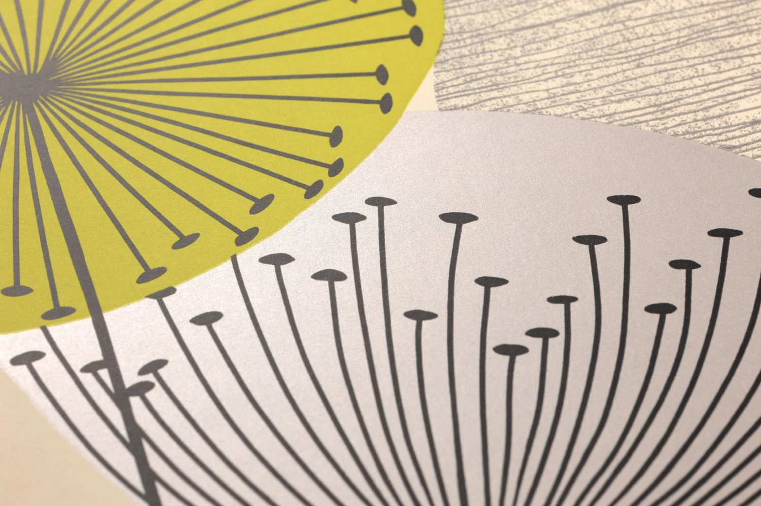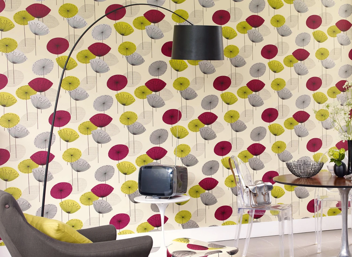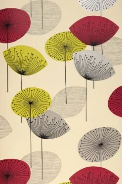 Beigegrau Schimmer, Bordeaux, Gelbgrün und Grau als Musterfarben bringen die stilisierten Löwenzahnblüten ordentlich in Bewegung und verstärken den poppigen Charakter der Vintage Tapete. Angelehnt an die Kultmuster der 50er und 60er Jahre, ist diese blumige Gute-Laune-Tapete für ausgefallene Retrostyles mehr als offen.