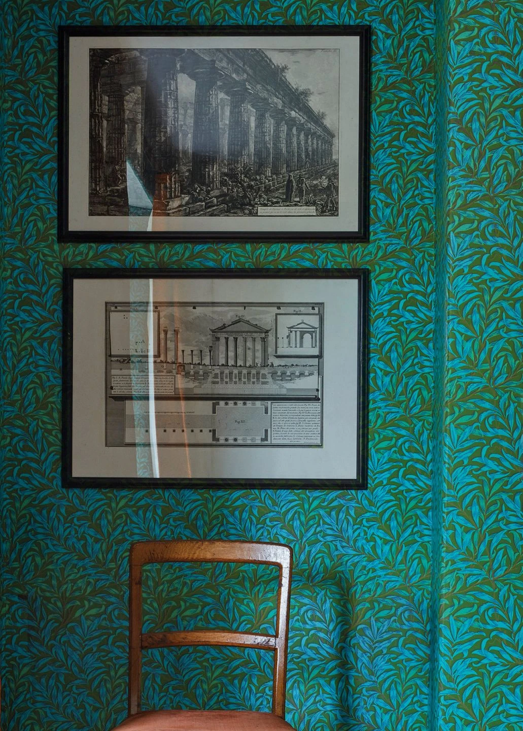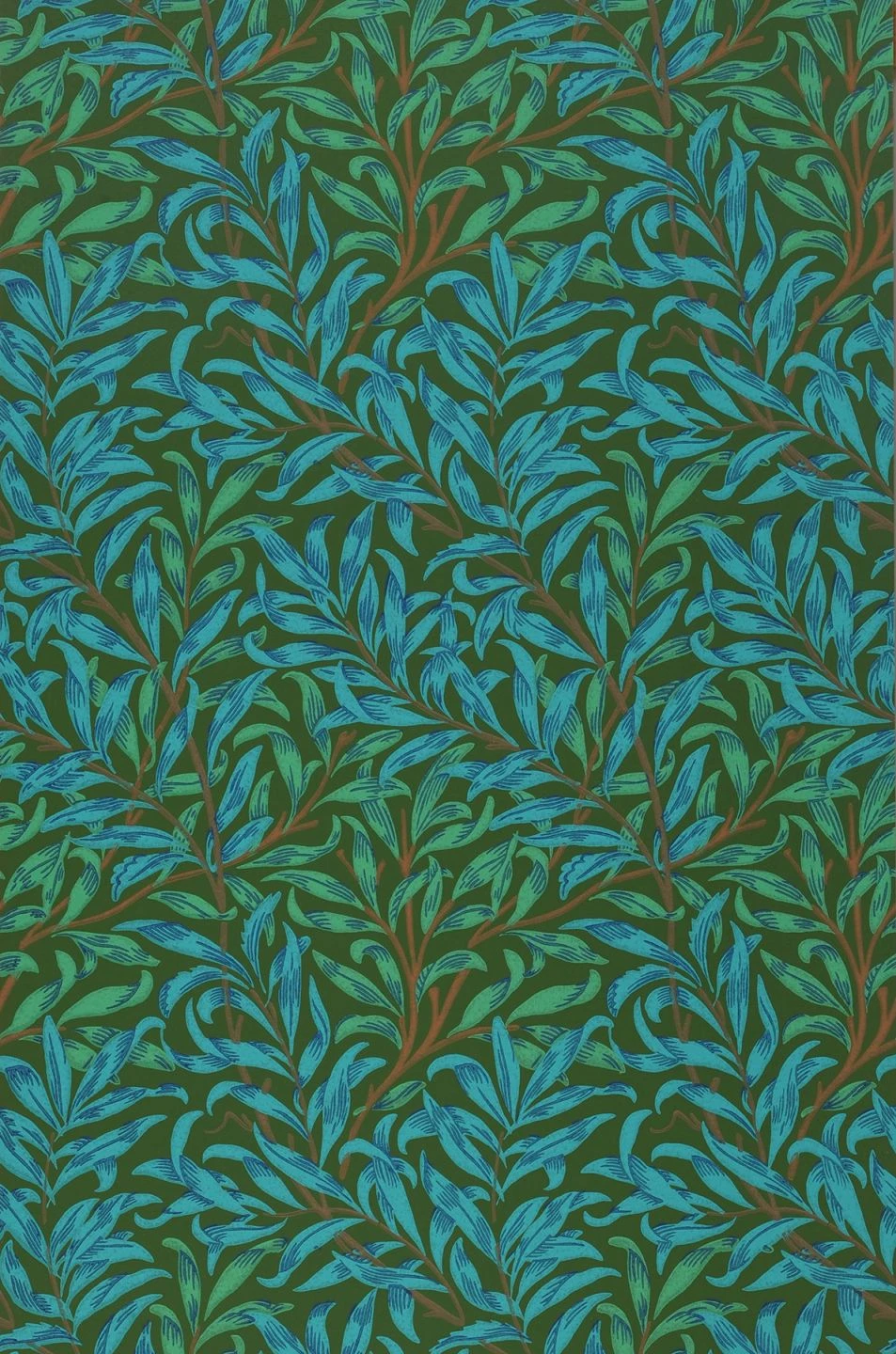 Intensiv türkis und blau sind die schlanken Blätter, die die Papiertapete wie ein dichtes Gebüsch bedecken. In Verbindung mit der olivgrünen Grundfarbe entwickeln die Farben eine große Strahlkraft. Die Tapete ist im Leimdruckverfahren hergestellt und strahlt durch diese traditionelle Drucktechnik den Charme des Handgemachten aus. „Darcie“ passt zu warmen Holztönen und zu antiken Möbeln besonders gut.