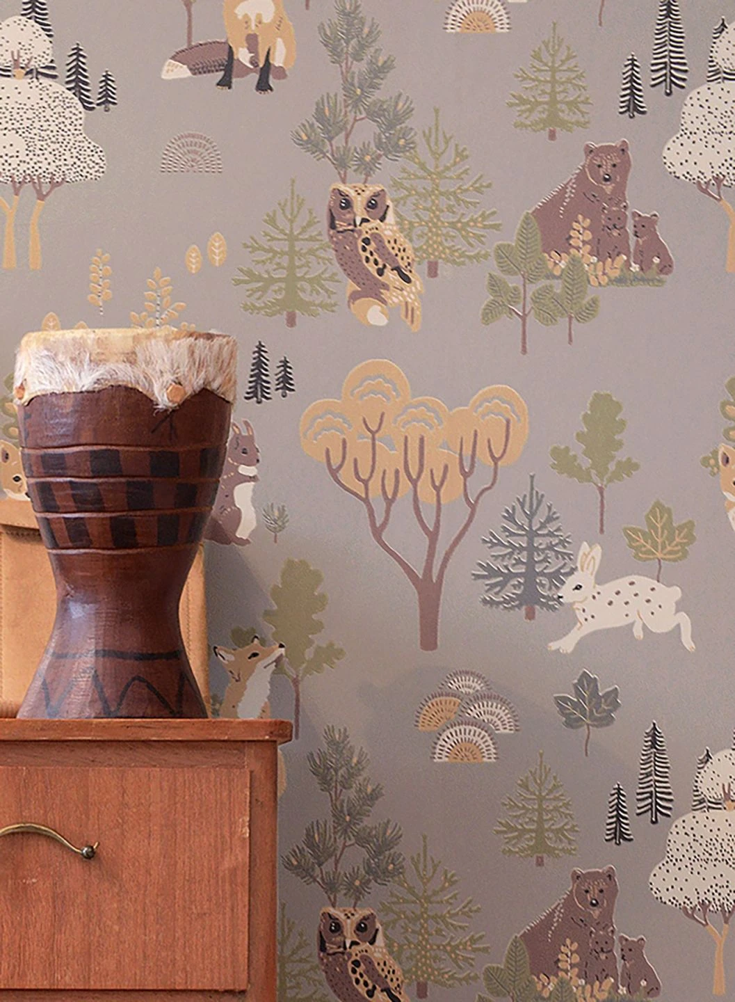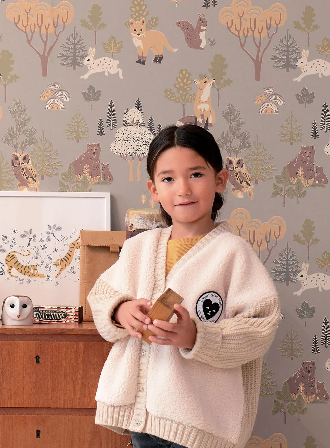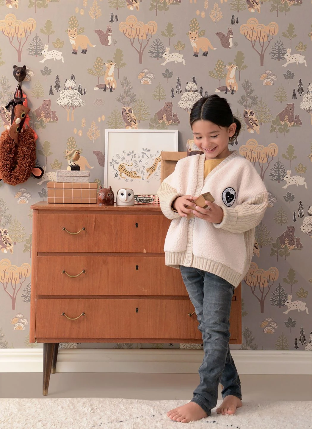 Geheimnisvoll wie in der Abenddämmerung scheint sich durch den grauen Untergrund Ruhe über den Wald auf der Vliestapete „Deep Forest“ zu senken. Und in der Abenddämmerung gibt es viel zu entdecken: Käuzchen und Füchse wagen sich hervor, eine Bärenfamilie sitzt im Gras, Kaninchen und Eichhörnchen huschen durchs Unterholz. Die Kinderzimmertapete lässt Ihren kleinen Naturforscher von seiner nächsten Entdeckungsreise in den Wald träumen.