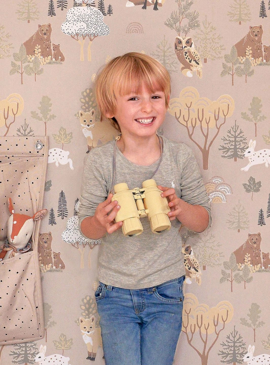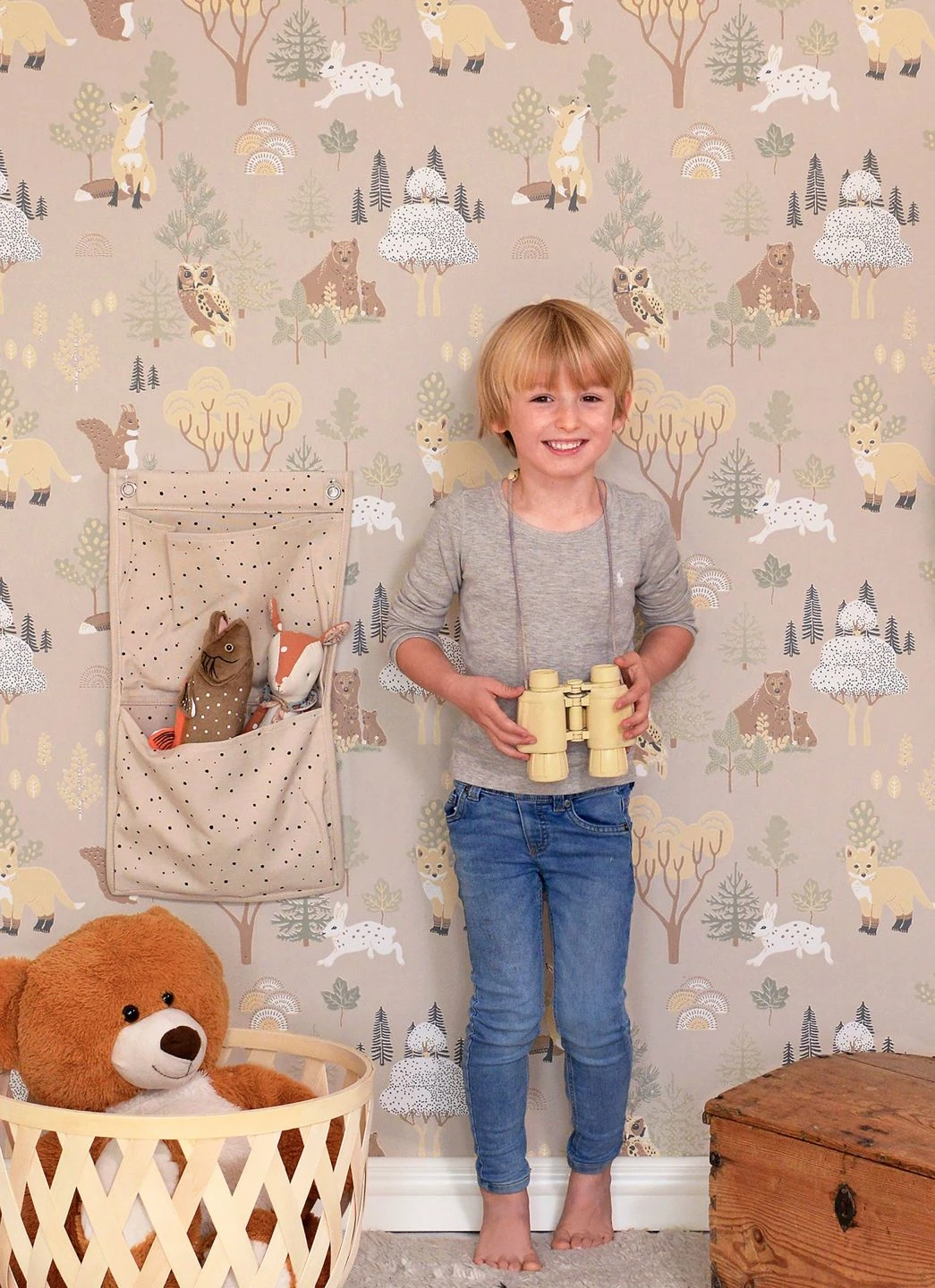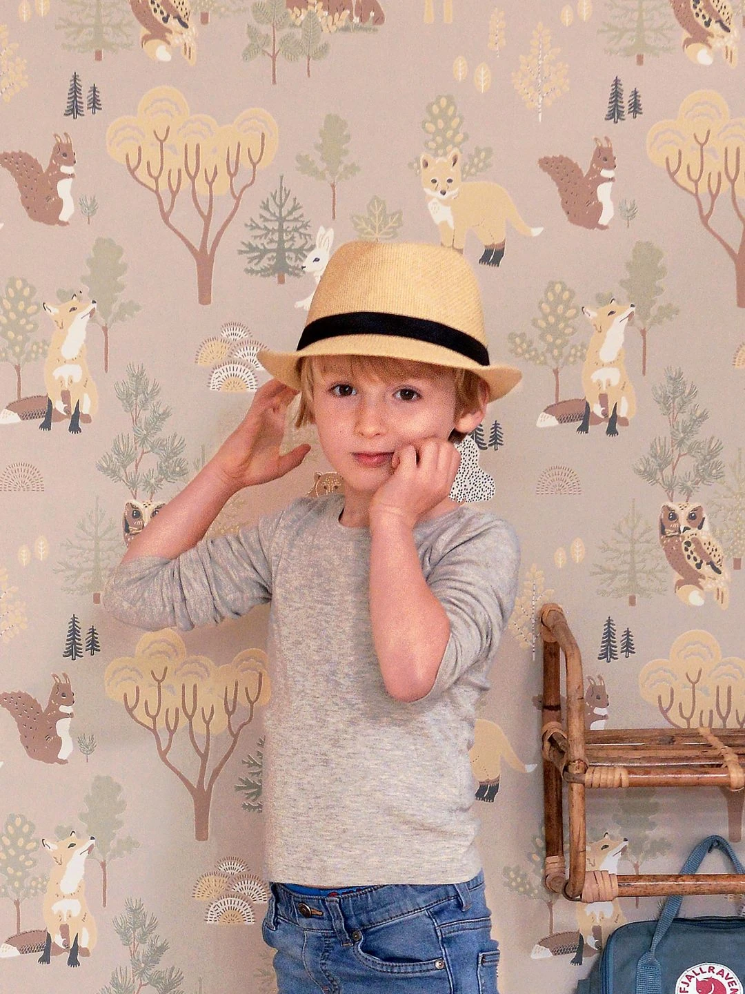 Frühlingshaft wirkt der Wald auf dem hellgraubeigefarbenen Grund der Vliestapete „Majvillan“. Zwischen den Bäumen tummeln sich viele Waldbewohner: Käuzchen und Bären, Hasen, Füchse und Eichhörnchen. Alle sind liebevoll gezeichnet und im Leimdruckverfahren auf die Kinderzimmertapete aus dem Hause Majvillan aufgebracht. Die Tapete regt kleine Entdecker zu vielen Abenteuern und Beobachtungen im Wald an.