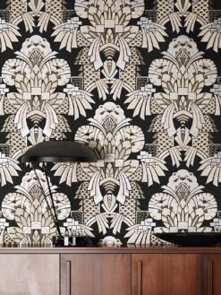 Fantastische Ornamente, von der Flora inspiriert und mit Grafik verfeinert, wirken wie Siegerschleifen, welche die Wand prachtvoll schmücken. Das keineswegs zurückhaltende Art Deco Muster in Silber und Grautönen vereint Kunstfertigkeit und Moderne, seine dominante Präsenz verlangt nach Aufmerksamkeit und Simple Chic bei den Möbeln.