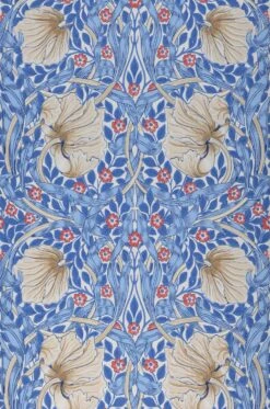 Im Mittelpunkt stehen bei diesem Design des britischen Künstlers und Designers William Morris die großen, wie Mohnblumen geformten Blüten. Sie neigen sich vom Betrachter weg und lenken den Blick auf den Hintergrund, ein komplexes Muster aus rotweißen Blüten und Blattranken in Blautönen auf dem weißen Grund. Die Jugendstil-Tapete ist im Leimdruckverfahren hergestellt, was dem Farbauftrag eine unverkennbare, handgemachte Optik verleiht.
