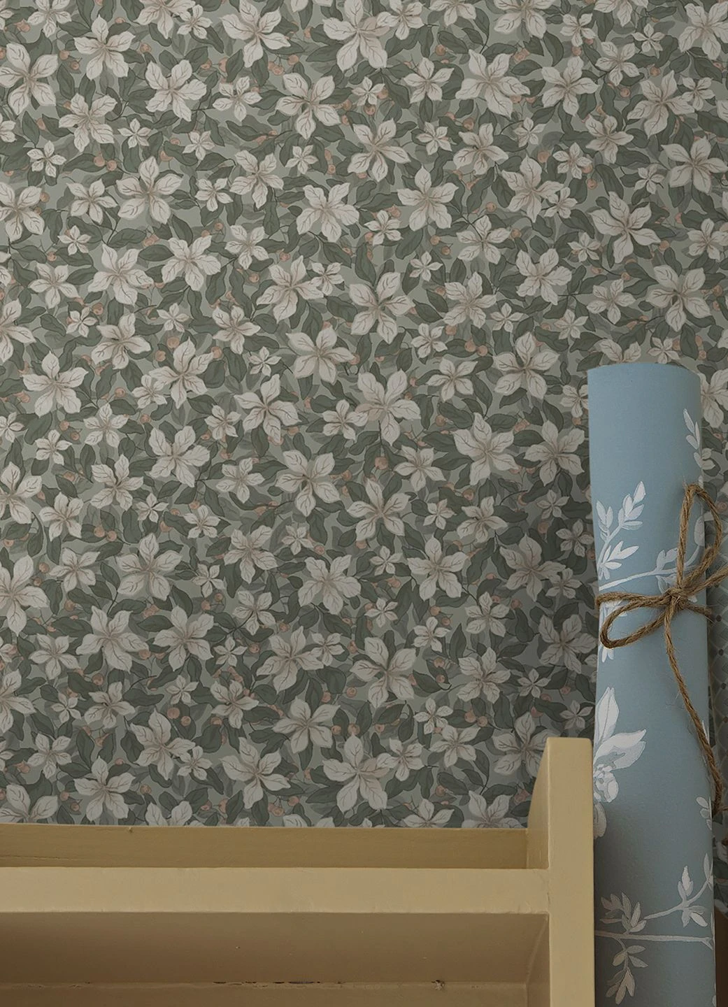 Das Beige und Cremeweiß der unzähligen Blüten und das Kieferngrün der Blätter ergeben zusammen mit dem Zartgrün des Untergrunds eine faszinierende, harmonische Farbkombination. Das Meer aus schön gezeichneten Blüten und Blättern, das Ihren Raum wie eine dichte, über und über blühende Hecke umgibt, verströmt ein Gefühl von Geborgenheit und Natürlichkeit, das besonders wirkungsvoll Ihre Einrichtung im skandinavischen oder auch im Landhausstil unterstützt.