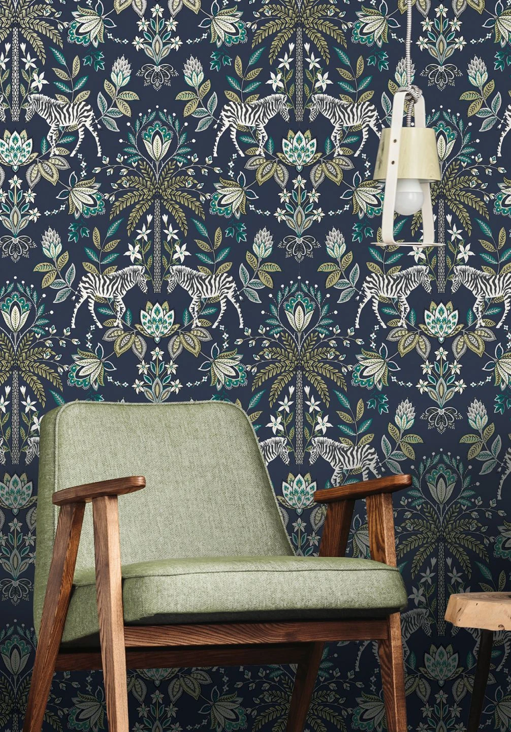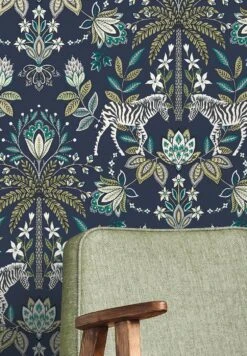 Kunstvoll stilisierte Blüten und Blätter, dazwischen Palmen und Zebras machen aus der Vliestapete „Fento“ einen wahren Augenschmaus. Auf dem geheimnisvolle Tiefe erzeugenden stahlblauen Hintergrund stechen das schimmernde Grünbeige und Silber besonders hervor. Die Symmetrie in der Anordnung der Musterelemente verleiht dem exotischen Muster die Anmutung einer klassischen Tapete. Weiße, beige- oder khakifarbene Möbel sind eine tolle Ergänzung.