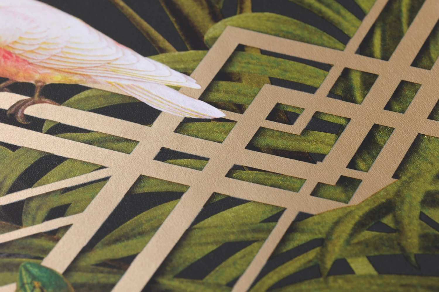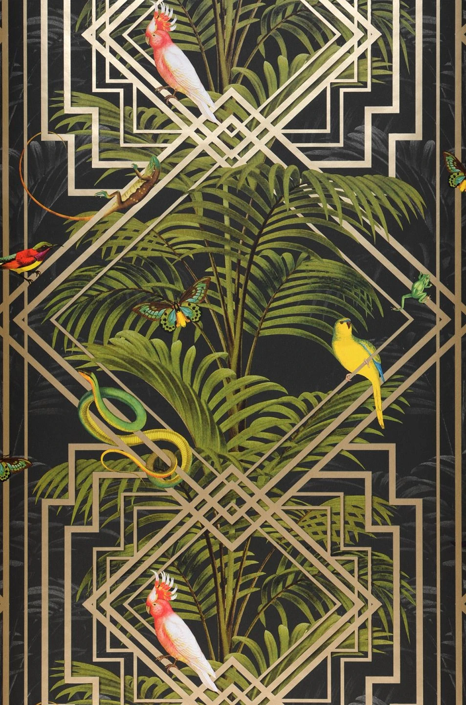 Art Deco in neuem Gewand und als Inspiration für zauberhafte Urlaubswelten, die in die eigenen vier Wände einziehen. Genießen Sie die lebendige Schönheit der Tropen, die stilvoll in das klassische Geometriemuster mit lichtfangendem Goldschimmer eingebettet ist. Die Grundfarbe Anthrazit verleiht der glamourösen Wandtapete intensive Tiefe.