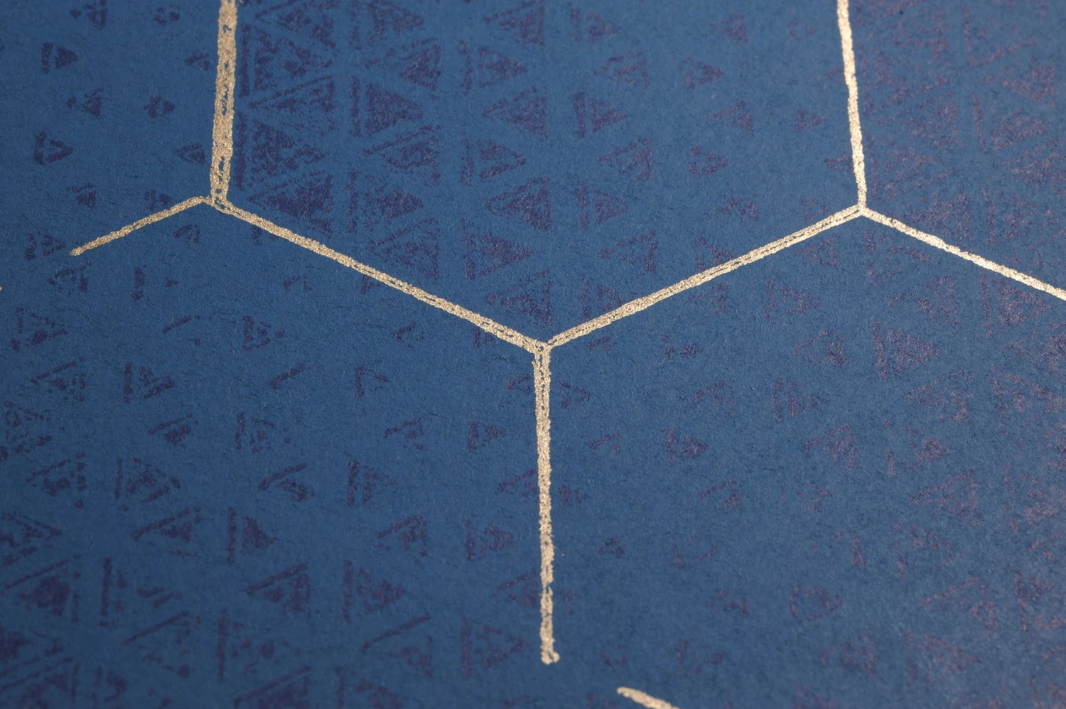 Aus zwei fein aufeinander abgestimmten Blautönen entstehen kleine Dreiecke, die die Flächen innerhalb der goldfarben eingefassten Sechsecke angenehm strukturieren. Das tiefe Dunkelblau und das Grünblau gehen mit dem Gold eine ästhetische Verbindung ein, die an Kacheln orientalischer Paläste erinnert. Die Vliestapete lässt sich mit Gold- und Blautönen oder auch Weiß in Ihrer Einrichtung herrlich kombinieren.