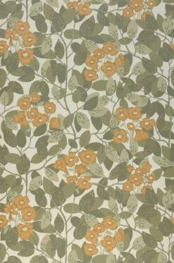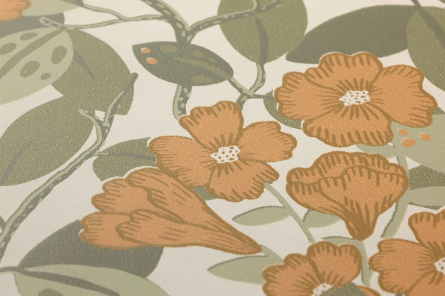Das charaktervolle Orangebraun der Blüten verbindet sich mit dem Blassgrün und dem Olivgrün der Blätter zu einer ästhetischen Einheit, aus der die Blüten leuchtend hervortreten. Farblich abgestimmte Details lassen Blätter und Blüten lebendig wirken. Das überbordende pflanzliche Leben in perfekter farblicher Harmonie schmückt Räume mit Möbeln in hellen oder dunklen Holztönen oder auch in Cremeweiß.