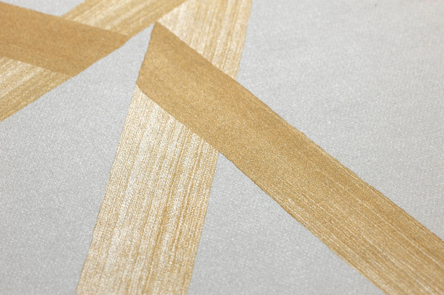 Gerade Bänder in luxuriösem Perlgold, wie mit dem Pinsel gezogen, bilden eine abstrakte geometrische Struktur auf dem schimmernden cremeweißen Untergrund. Wie zufällig treffen und kreuzen sich die Bänder und schaffen eine Vielzahl unterschiedlich geformter Flächen. Die Helligkeitsverläufe, wie sie beim Führen des Pinsels entstehen, suggerieren räumliche Tiefe und sorgen für eine faszinierende und edle Raumwirkung.