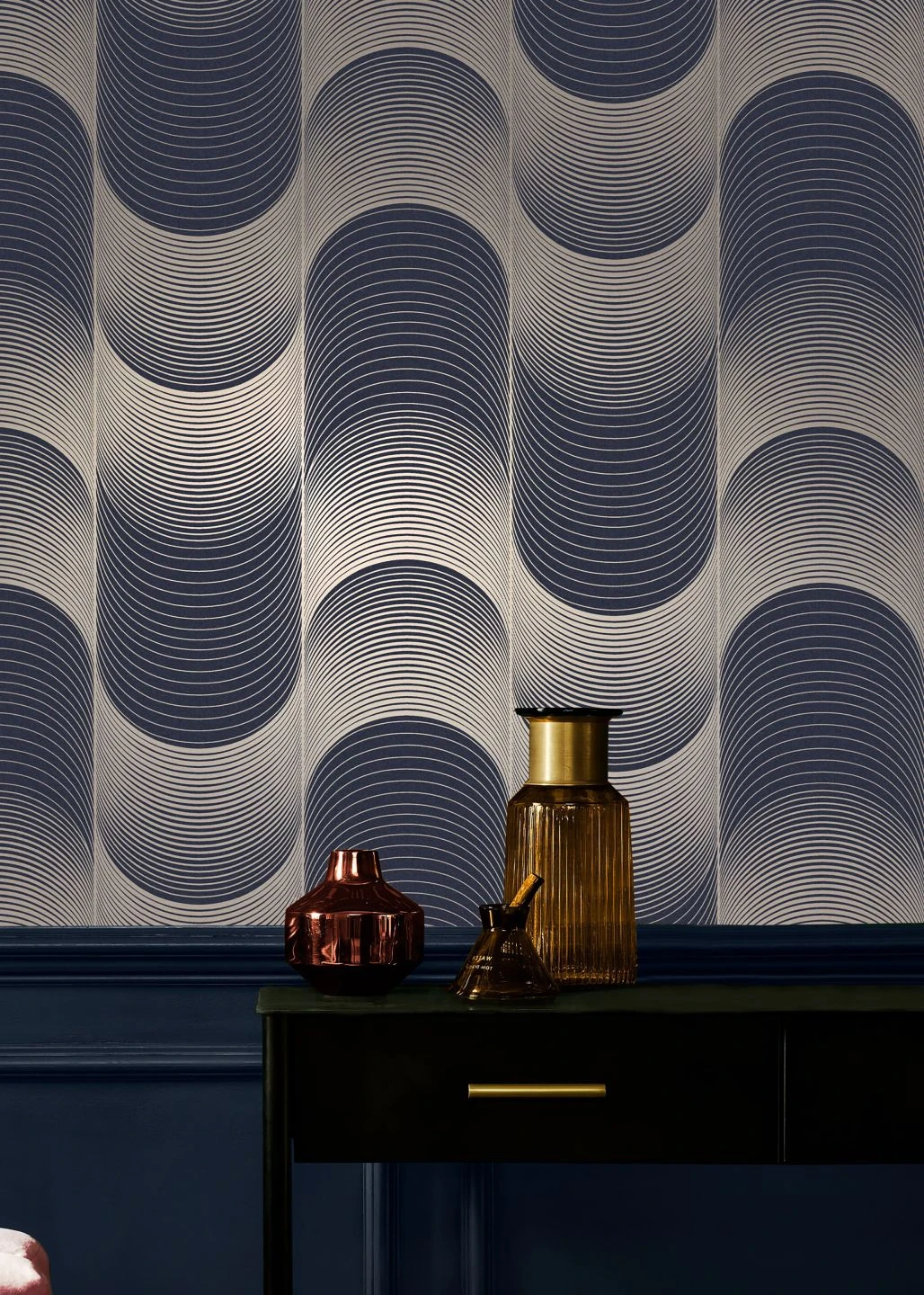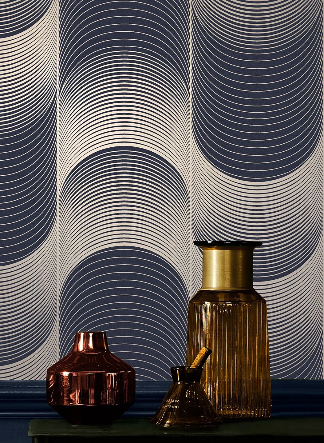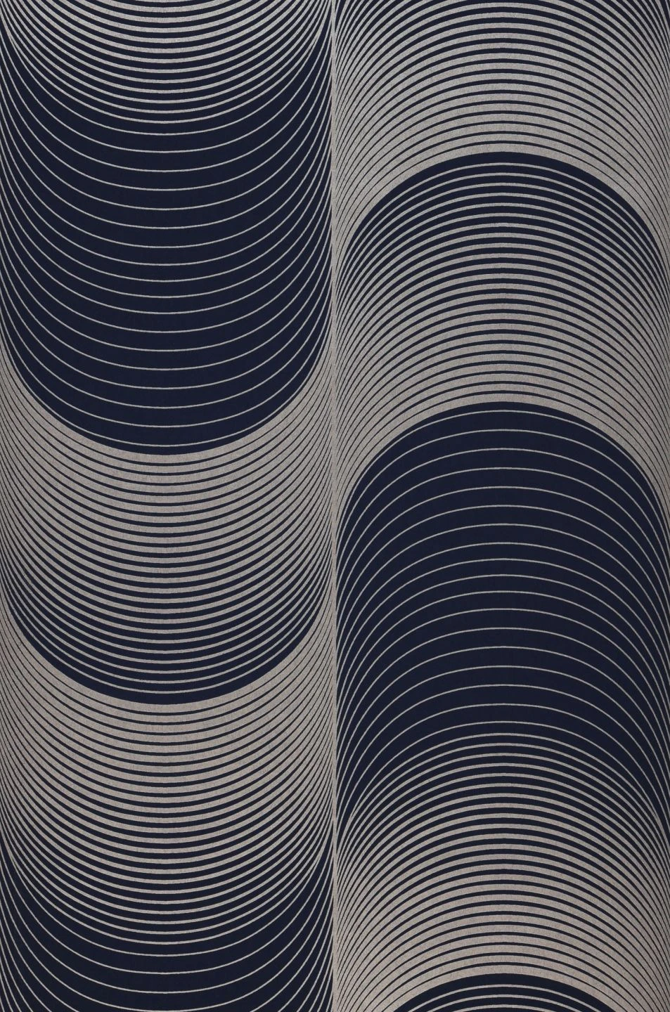 Ein verblüffender optischer Effekt entsteht durch das geometrische Muster. Die wellenförmigen, verschieden starken Linien machen aus der Fläche Ihrer Wand ein dreidimensionales Auf und Ab, das fast bewegt wirkt. Dunkles Blau und schimmerndes Weißaluminium strahlen angenehm kühle Eleganz mit einer Spur luxuriöser Extravaganz aus. Weiße oder dunkelblaue Möbel schaffen geradlinige Ankerpunkte als Kontrast.