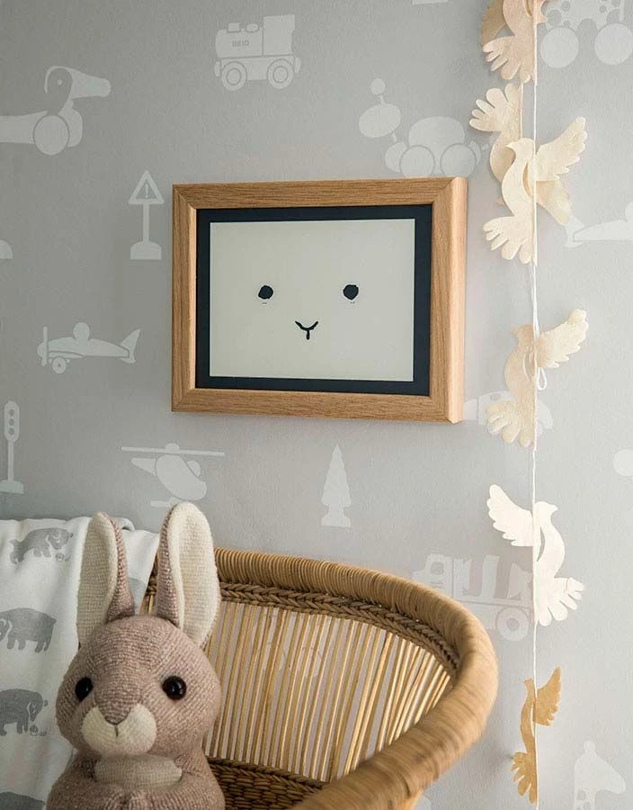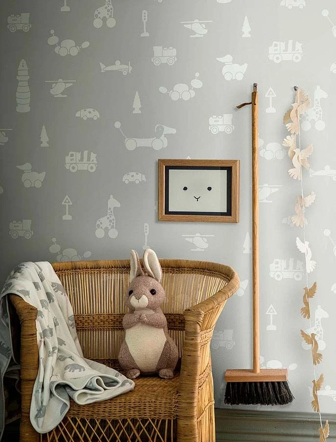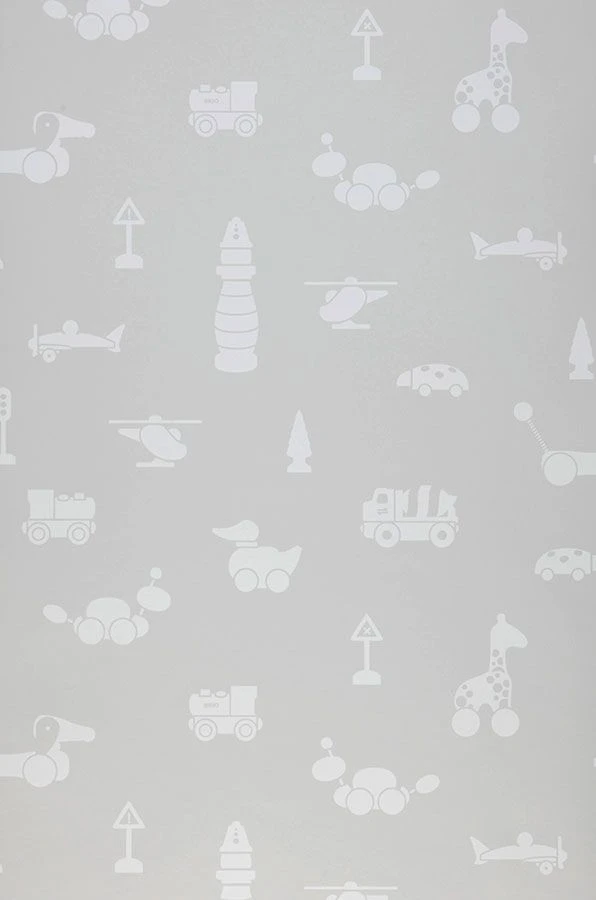 Beliebte Spielzeugelemente, die für die Kleinsten leicht verständlich sind, bieten sich auf Kindertapete Kivia in den angenehmen und beruhigenden Kontrastfarben Grau und Weiß. Die waschbeständige Vliestapete mit lustigen Ziehtieren, Bäumen, Fahrzeugen darf gerne intensiv bespielt werden, denn sie kann so einiges vertragen.