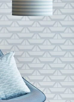 Aus den klassischen Grundformen der Geometrie zusammengesetzt, ist dieses symmetrische Faltschiff-Muster entstanden, das für frischen Pepp im Raum sorgt. Schwimmen Sie mit auf dieser Welle der Leichtigkeit in maritimen Farbtönen.