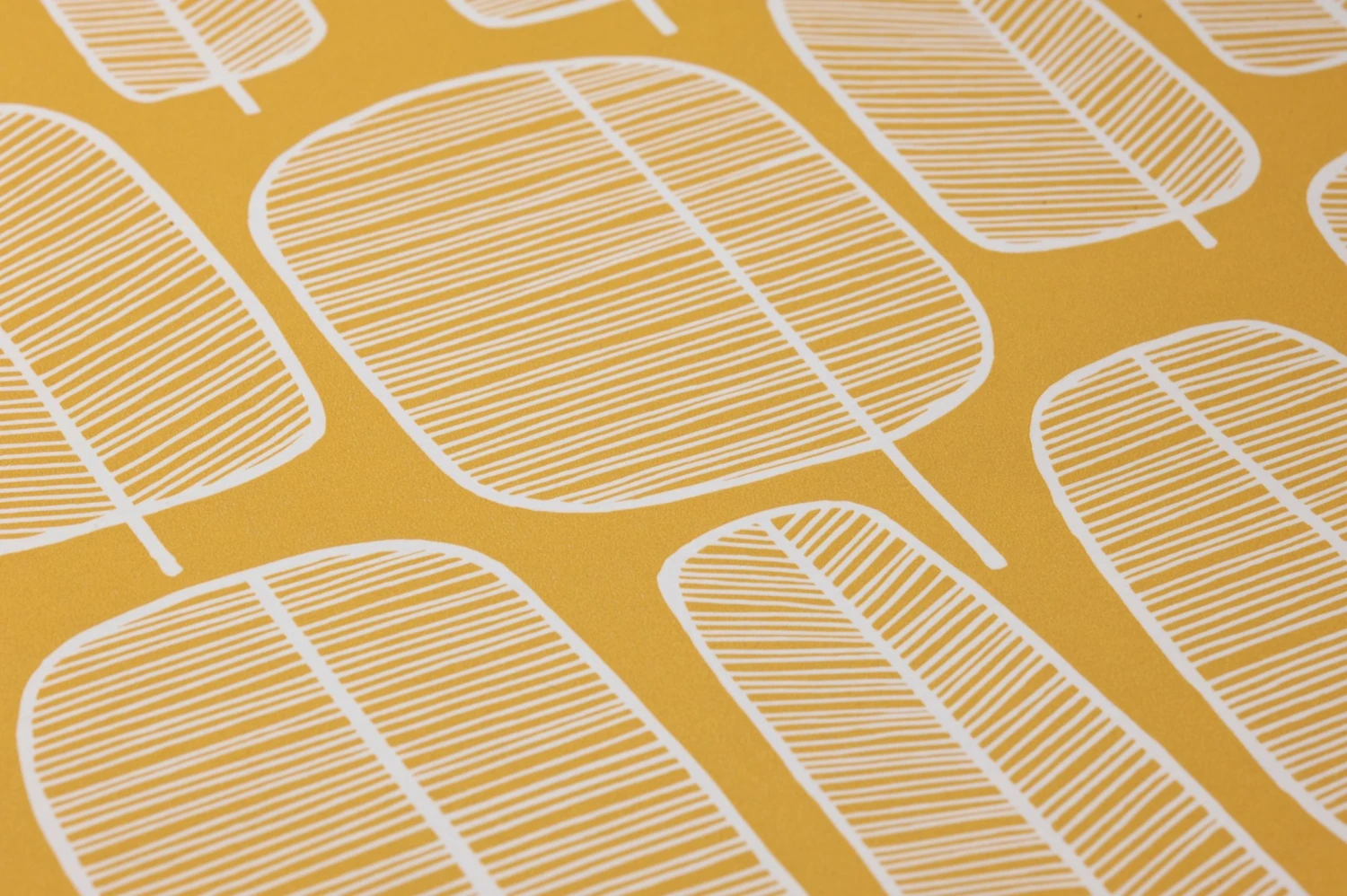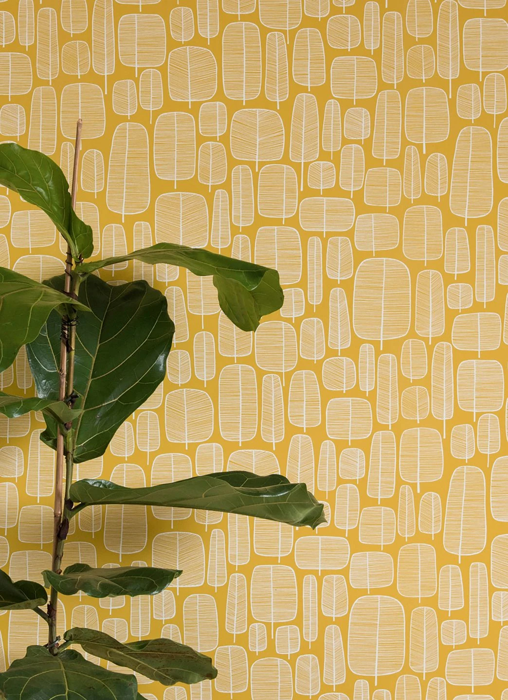Sonnig leuchtendes Goldgelb bildet den Hintergrund eines stilisierten lichtdurchfluteten Waldes, der durch einfache Schraffur angedeutet wird. Die verschiedenartigen Formen der Bäume stehen für die Vielfalt der Natur und schaffen doch durch die schlichte Zeichentechnik ein geschlossenes Gesamtbild. Die hellen, fröhlichen Farben sorgen für sommerliche Atmosphäre.
