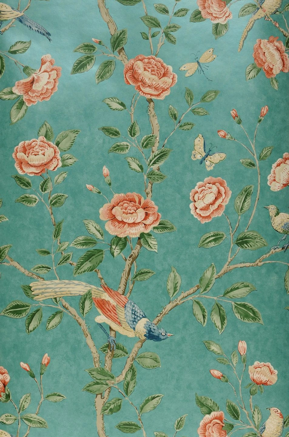 Korallenrot- und Cremetöne in verschiedenen Helligkeitsstufen, dazu Dunkelblau und Grüntöne herrschen vor in den Blüten, Blättern und dem Gefieder der farbenprächtigen Vögel und Schmetterlinge auf dieser Tapete. Der türkisfarbene Hintergrund hat eine leicht schimmernde Struktur und setzt sich so von den bunten Musterfarben ab. Es entsteht der Eindruck einer kostbaren historischen Illustration. Perfekt ergänzt wird die Tapete mit einer der passenden Wandfarben.