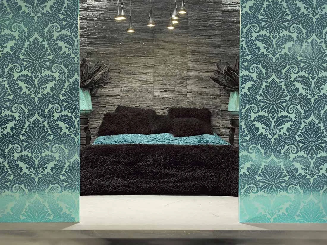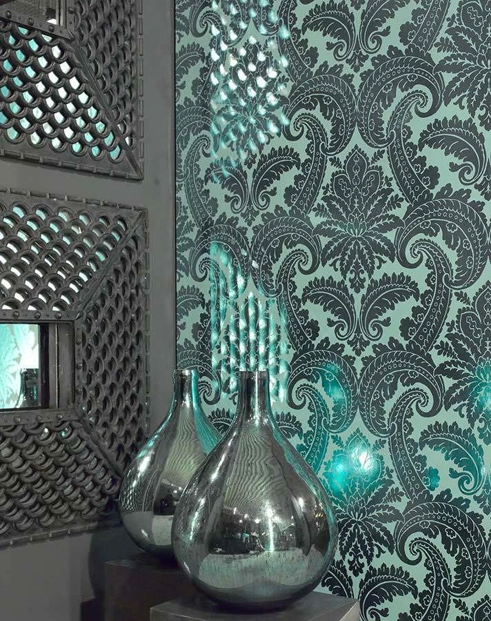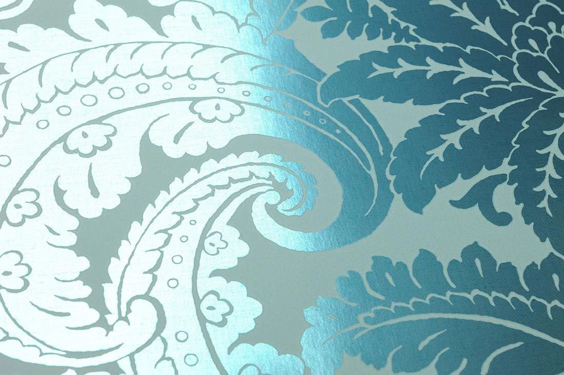 Auf den ersten Blick ein üppiges Barockmuster, das aus Blüten, Blättern und Blattranken eine abstrakte Symmetrie entstehen lässt. Der Clou liegt im Material und in dem Effekt, den es erzielt: Die smaragdgrün glänzenden Ornamente heben sich vom pastelltürkisen Untergrund durch Farbe und Glanz gleichermaßen ab. So entsteht ein interessanter Kontrast zwischen den Oberflächen, während die enge Verwandtschaft der verwendeten Farbtöne für den Zusammenhalt sorgt.