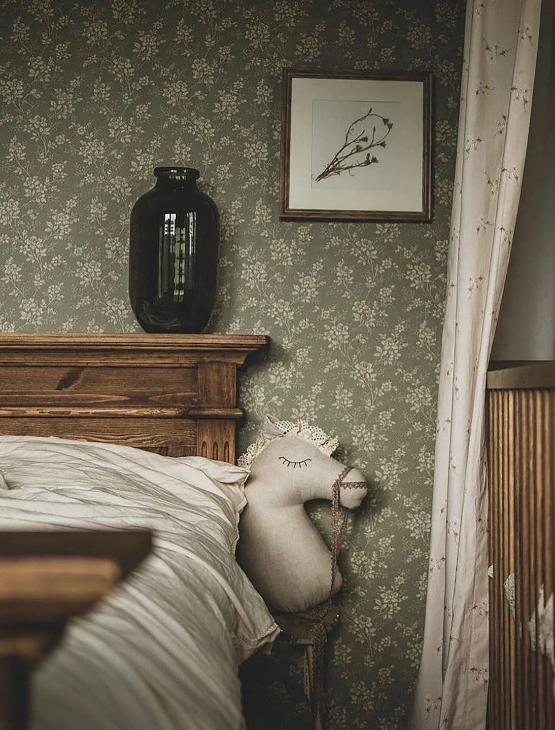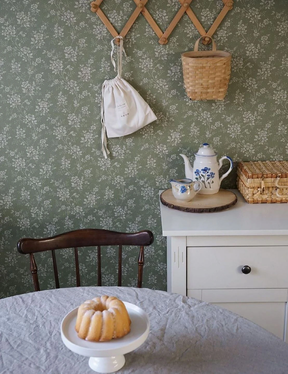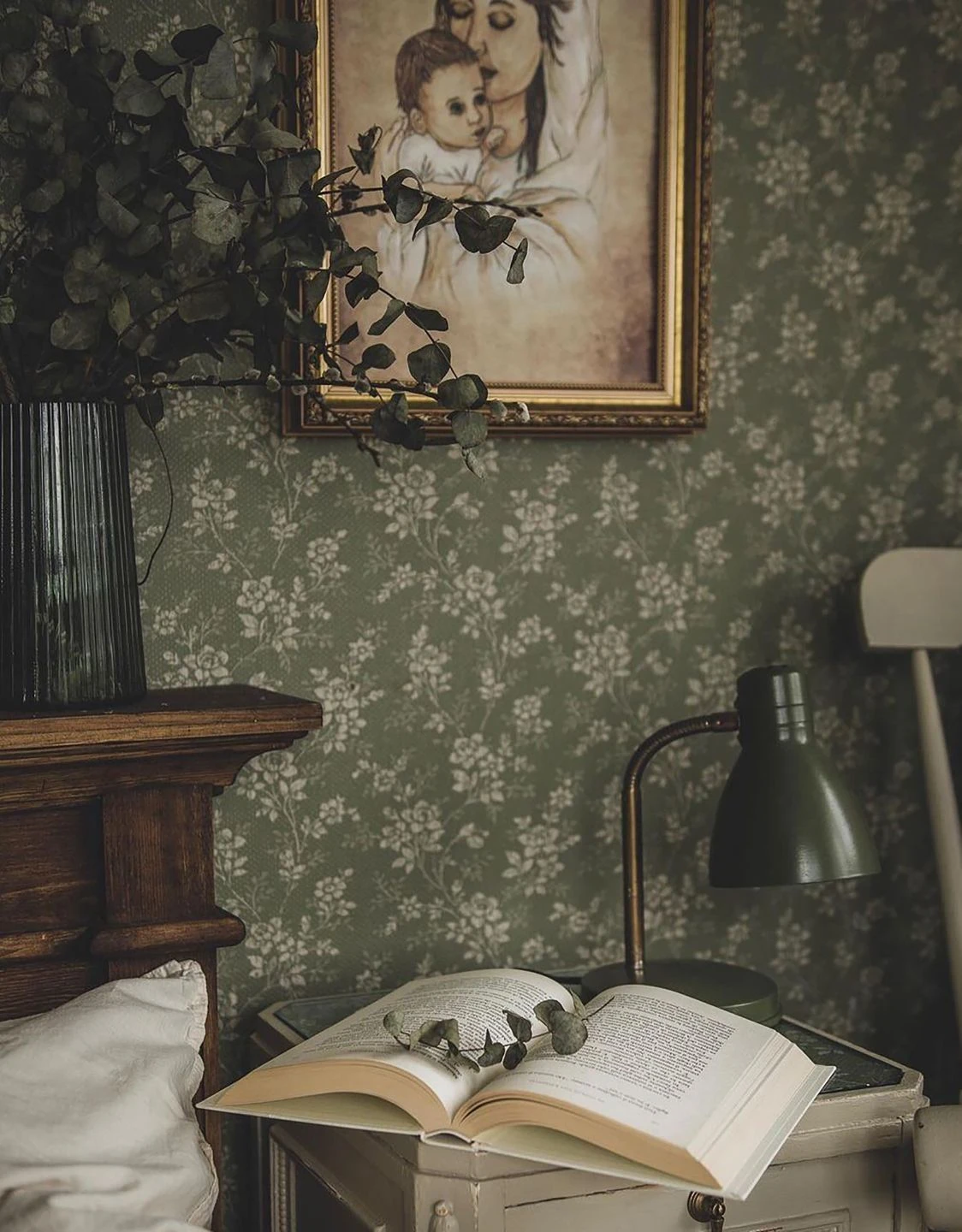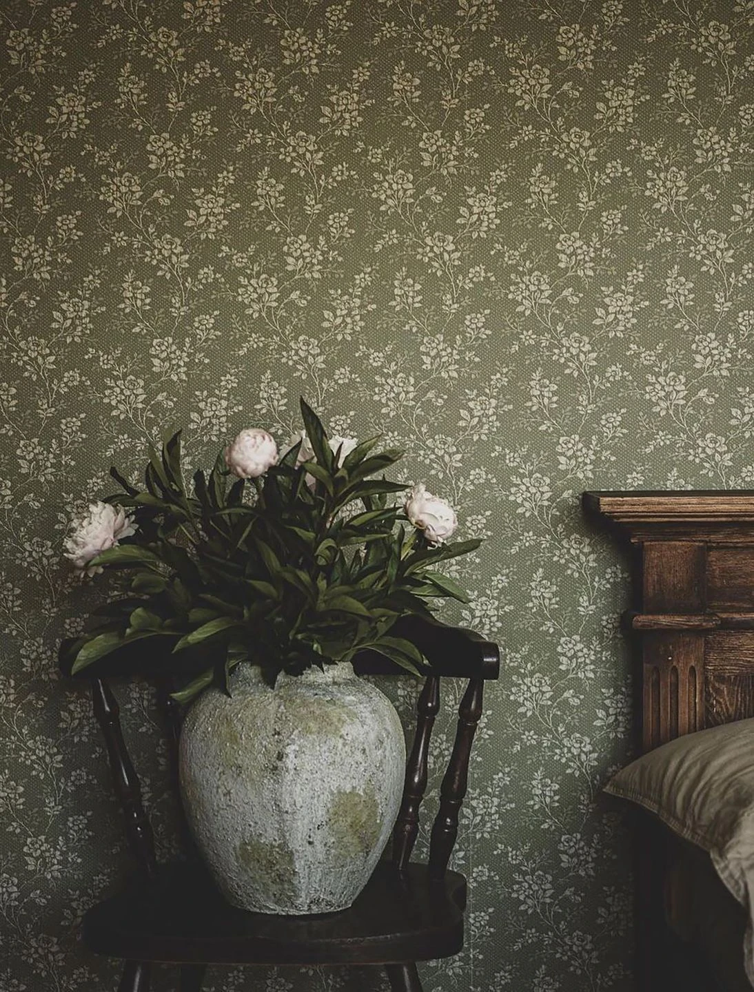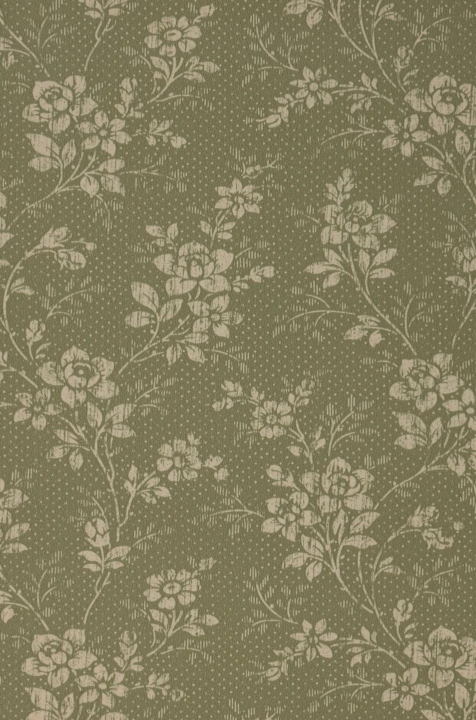 Cremeweiße Blüten und Blattranken auf schilfgrünem, mit feinen Punkten dekoriertem Grund verströmen ihren Vintage-Charme. Die zarten Blüten und filigranen Zweige passen ebenso gut in ein gemütliches Wohnzimmer wie ein Schlafzimmer oder eine Küche. Besonders antike Möbel kommen in Kombination mit der Vliestapete Patricia wunderbar zur Geltung. Alle Holztöne ergänzen das Schilfgrün vorteilhaft.