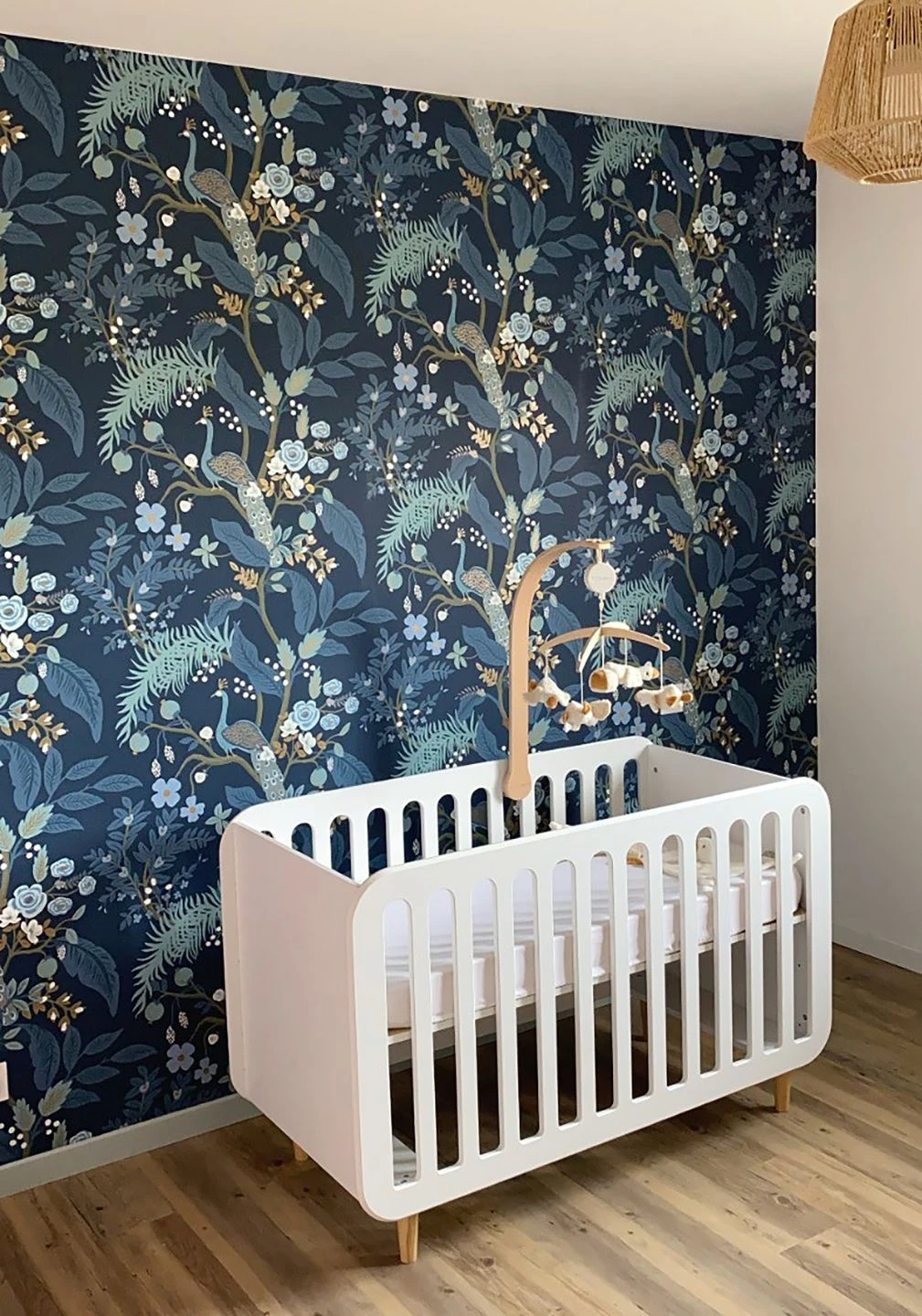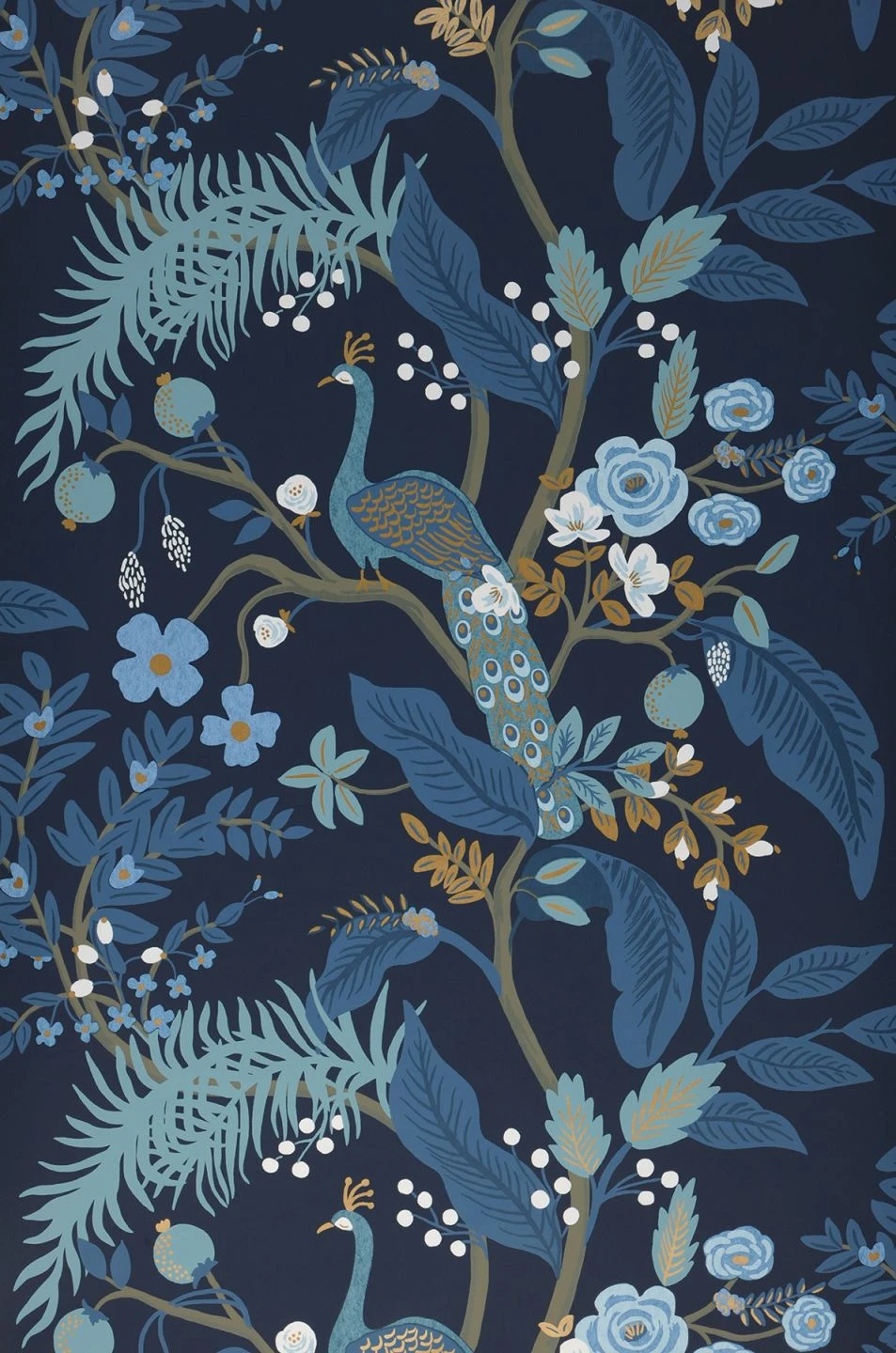 Üppige tropische Pflanzen, Blätter und Blüten, dazwischen Pfauen mit ihren majestätischen Schwanzfedern – die Vliestapete in verschiedenen Blautönen von Brillantblau bis Pastelltürkis erweckt die magische Atmosphäre einer Tropennacht zur blauen Stunde zum Leben. Tupfer aus Perlgold setzen Highlights, als würde das rötliche Licht des aufgehenden Mondes auf die Landschaft scheinen. Die Harmonie der Farben macht diese Tapete zu einem ästhetischen Genuss.