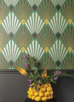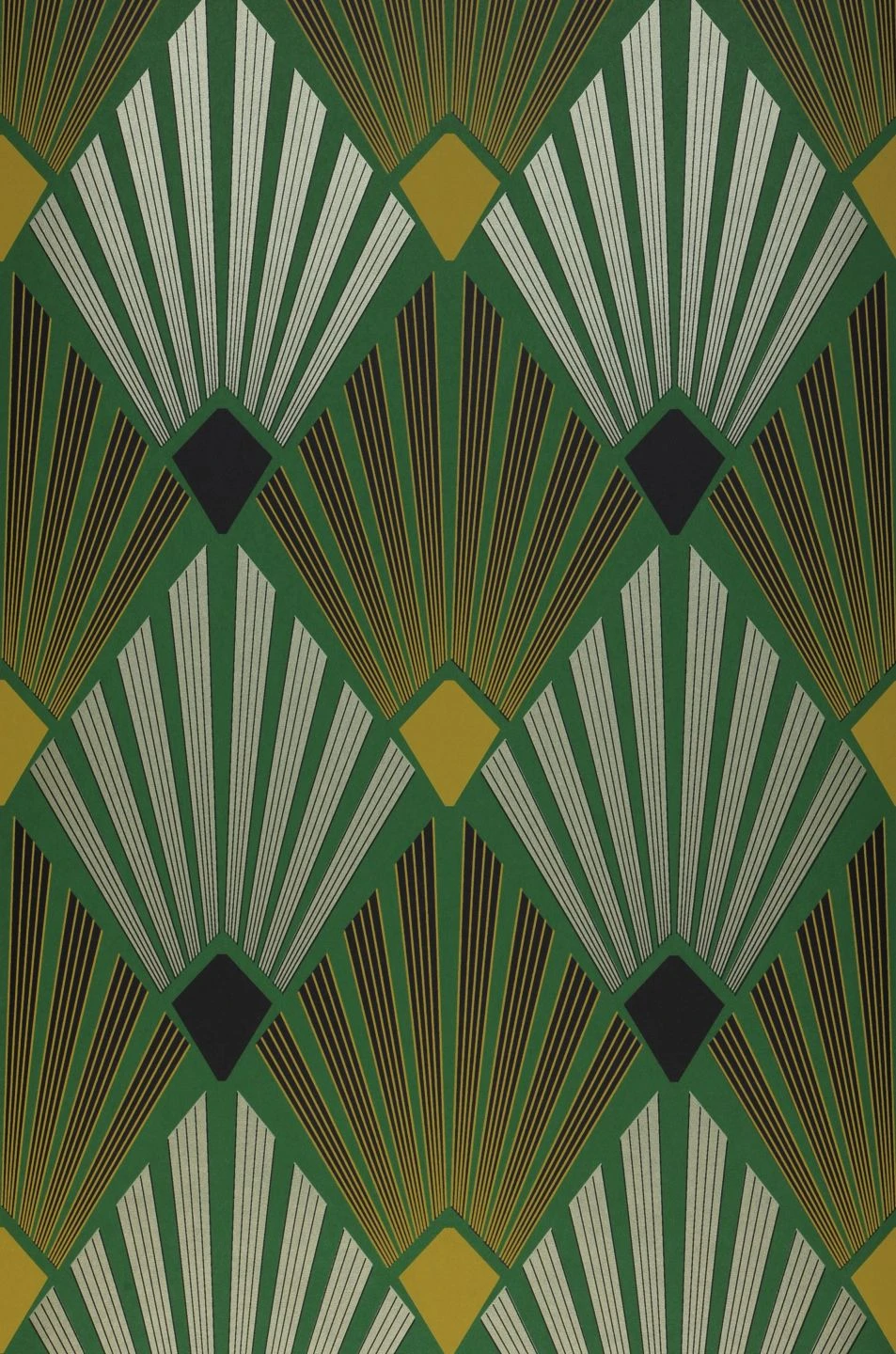 Die kühle, gestylte Eleganz des Art Deco hat seit ihrer Blütezeit nichts an Wirkung eingebüßt. Mit ihren typischen fächerförmigen Elementen aus sich verbreiternden Strahlen, unterstützt vom leuchtenden Gelb und Weiß auf dem grünen Hintergrund, strahlt Pontinius eine positive Dynamik und Aufbruchsstimmung aus. Das extravagante Design bringen Sie mit Vintage-Möbeln aus der Zeit des Art Deco zur Vollendung.