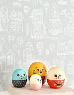 Themenwelten für Kinder bestimmen die Handschrift des Tapetenlabels Majvillan. Die kleine Stadt mit kindgerecht grafisch umgesetzten Häusern, Gebäuden, Bäumen ist auf der grau-weißen Farbvariante mit Elementen vom Jahrmarkt gespickt. Karussell, Riesenrad, Heißluftballon verwandeln die Stadt in eine Erlebnisstadt.