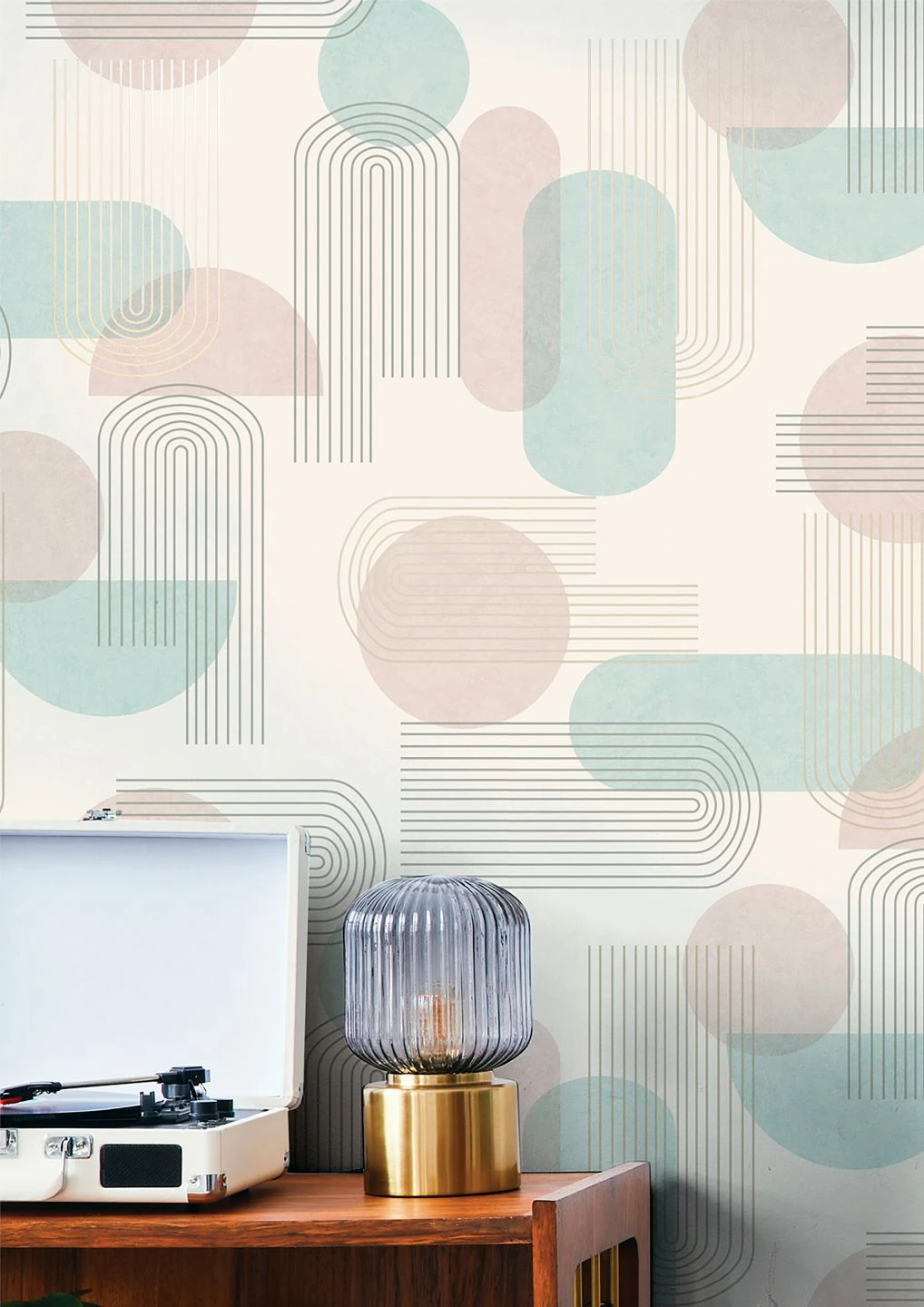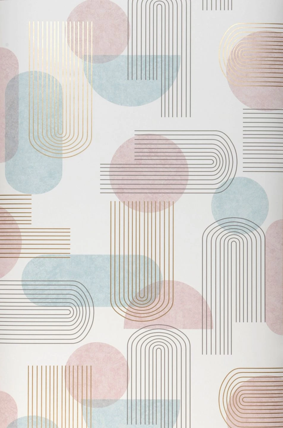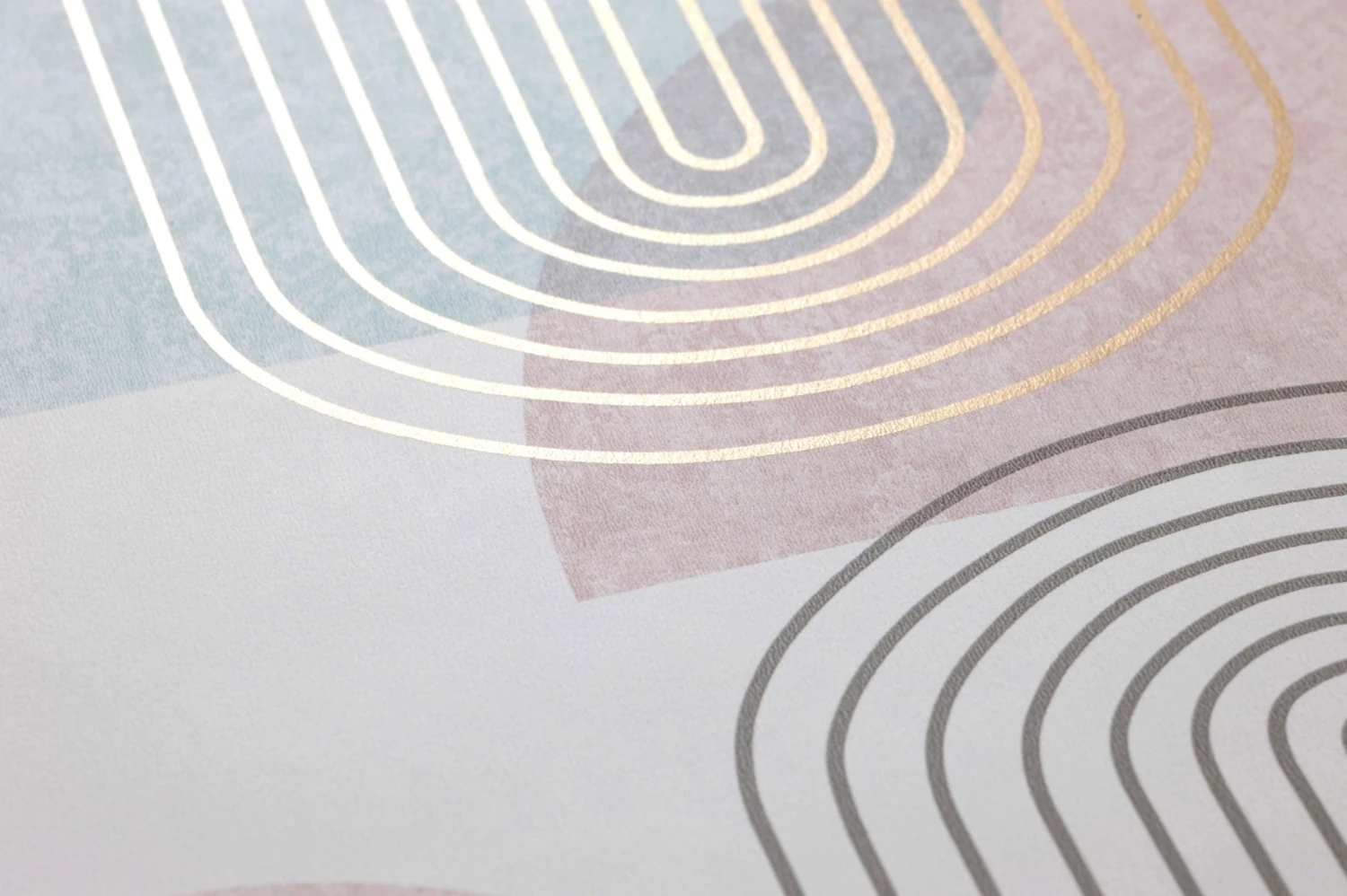 Die klare Formensprache des Bauhauses findet sich in den grafischen Ornamenten der Papiertapete Ultra zu einem luftigen Retro-Design aus Kreisen und Ovalen zusammen. Zwischen dem hellen Grau, Pastellrosa und Pastelltürkis auf dem weißen Grund steuern bogenförmige goldfarbene Linien schimmernde Akzente bei. In Verbindung mit Retro-Möbeln in den passenden Farben schaffen Sie ein stimmiges Ambiente mit nostalgischem Touch.