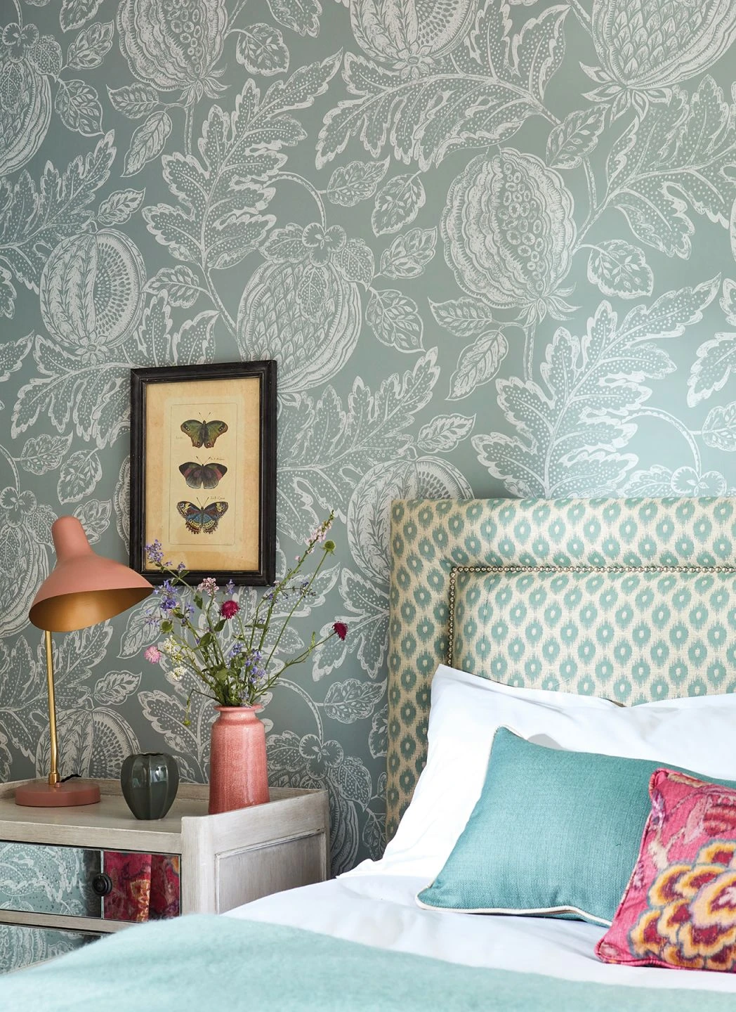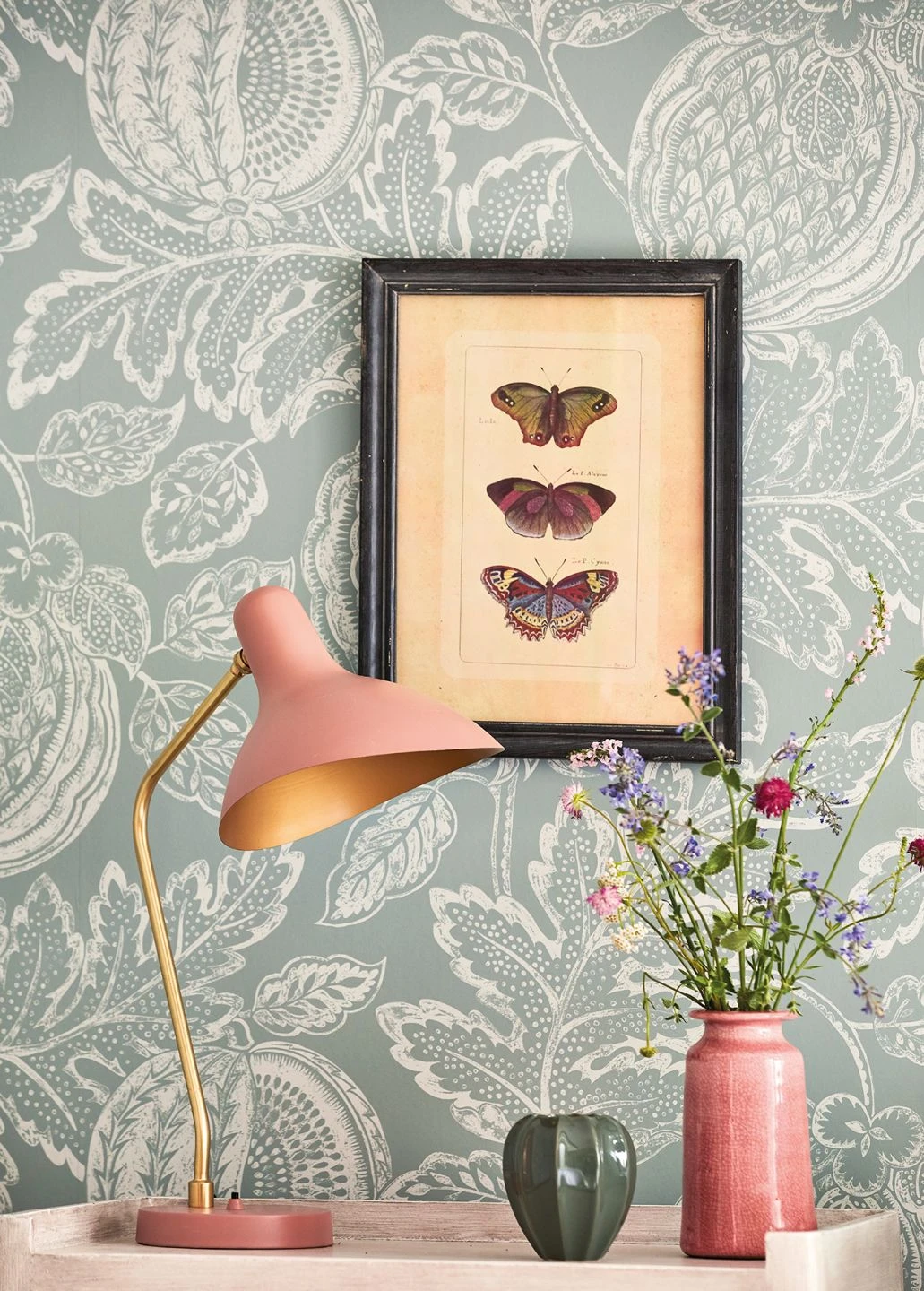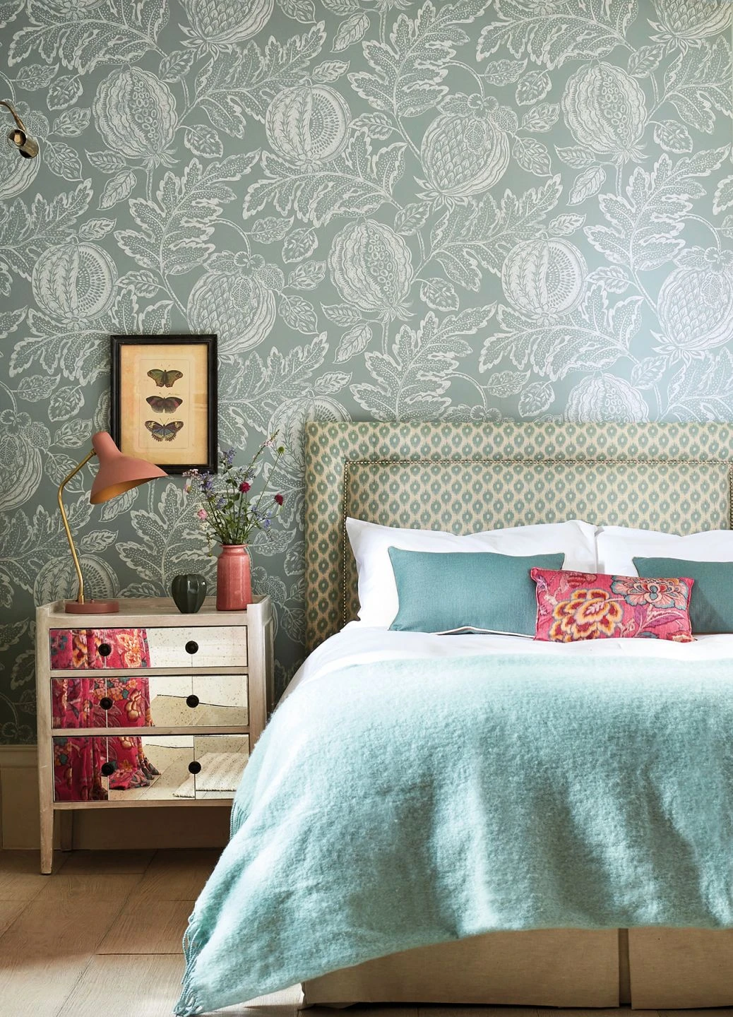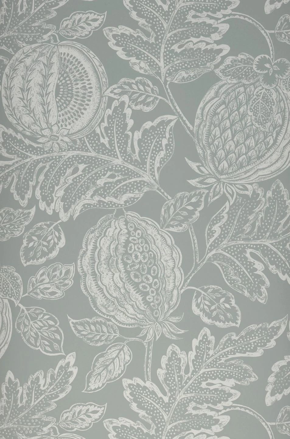 Mit ihrem Detailreichtum bietet diese Tapete eine ungewöhnliche Perspektive. Wie mit einem Makro-Objektiv aufgenommen wirken die überdimensionalen Früchte und Blätter, die in grauweißer Farbe als Umrisse und Schattierungen auf dem blassminttürkisen Untergrund zu sehen sind. Bis ins kleinste Detail sind die Strukturen der Früchte und die feinen Pünktchen und Adern der Blätter liebevoll dargestellt und beleben Ihre Wände mit dem Zauber des Mikrokosmos.