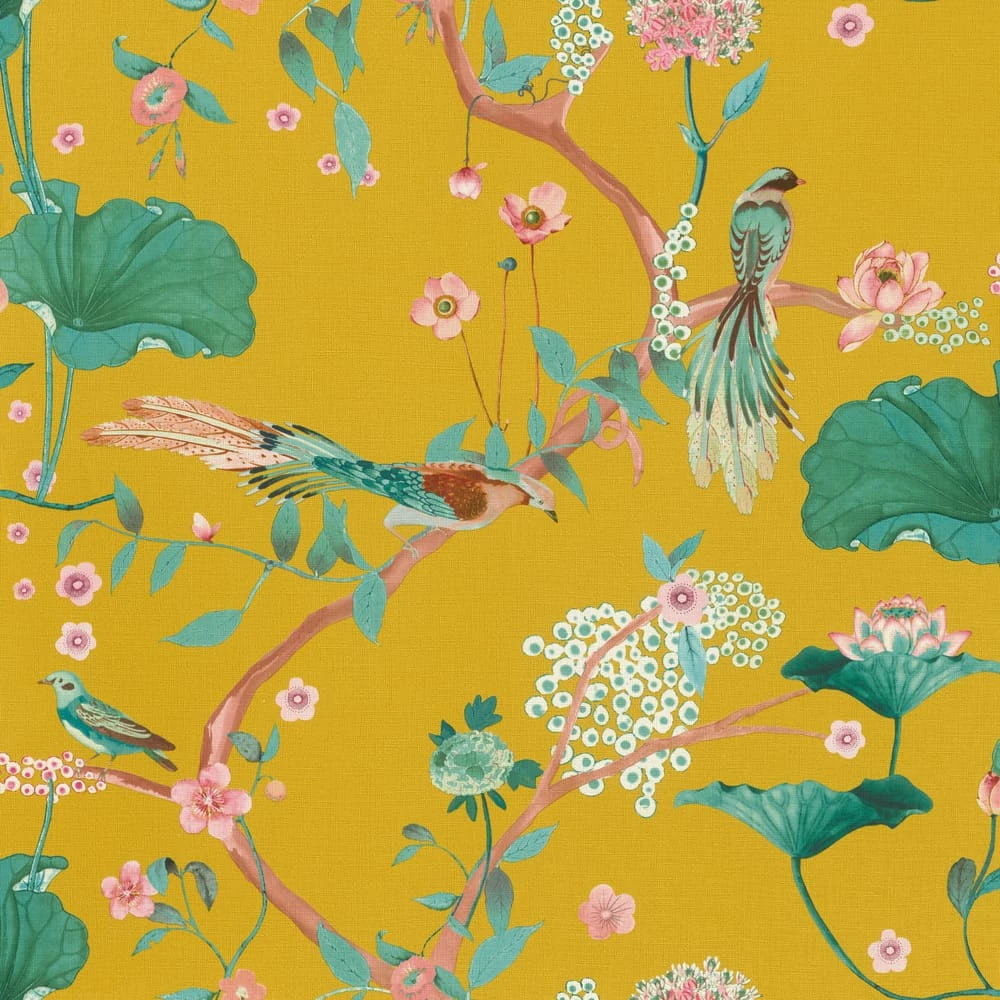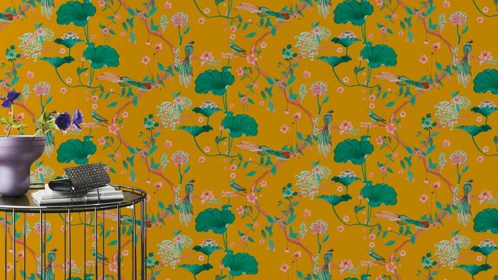 Tapete Vlies Rasch Onszelf Blätter Vögel Zweige gelb grün rosa Amazing 539448