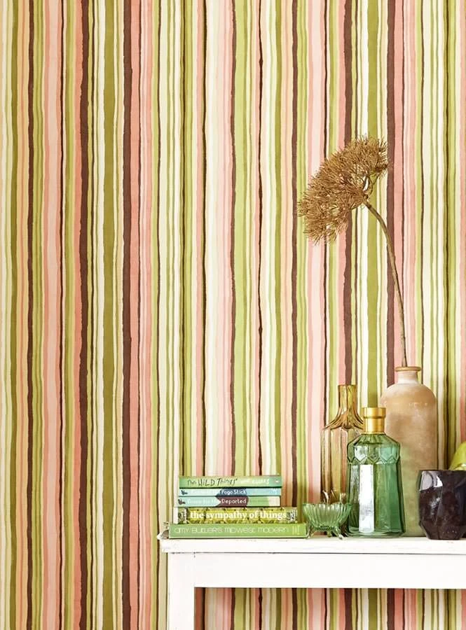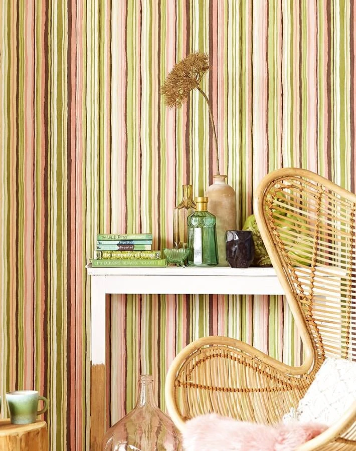 Geradlinigkeit nimmt Streifentapete Zeno nicht so wörtlich. Warum auch – Frei Hand gezeichnete Linien und Streifen in natürlichen Waldfarben wie Beige, Beigerot, Farngrün und Sepiabraun zeigen, dass Bewegung im Spiel ist und sich etwas tut. Dieses offensive Streifenmuster regt die Fantasie an und setzt einen gekonnten Kontrast zu einer zurückhaltenden schnörkellosen Einrichtung. Mit Möbeln aus Naturmaterialien wie Holz, Rattan, Bast verschmilzt die hochwertige Vliestapete zu einer sehr ursprünglichen Einheit – ganz nach dem Motto „Zurück zu den Wurzeln“.