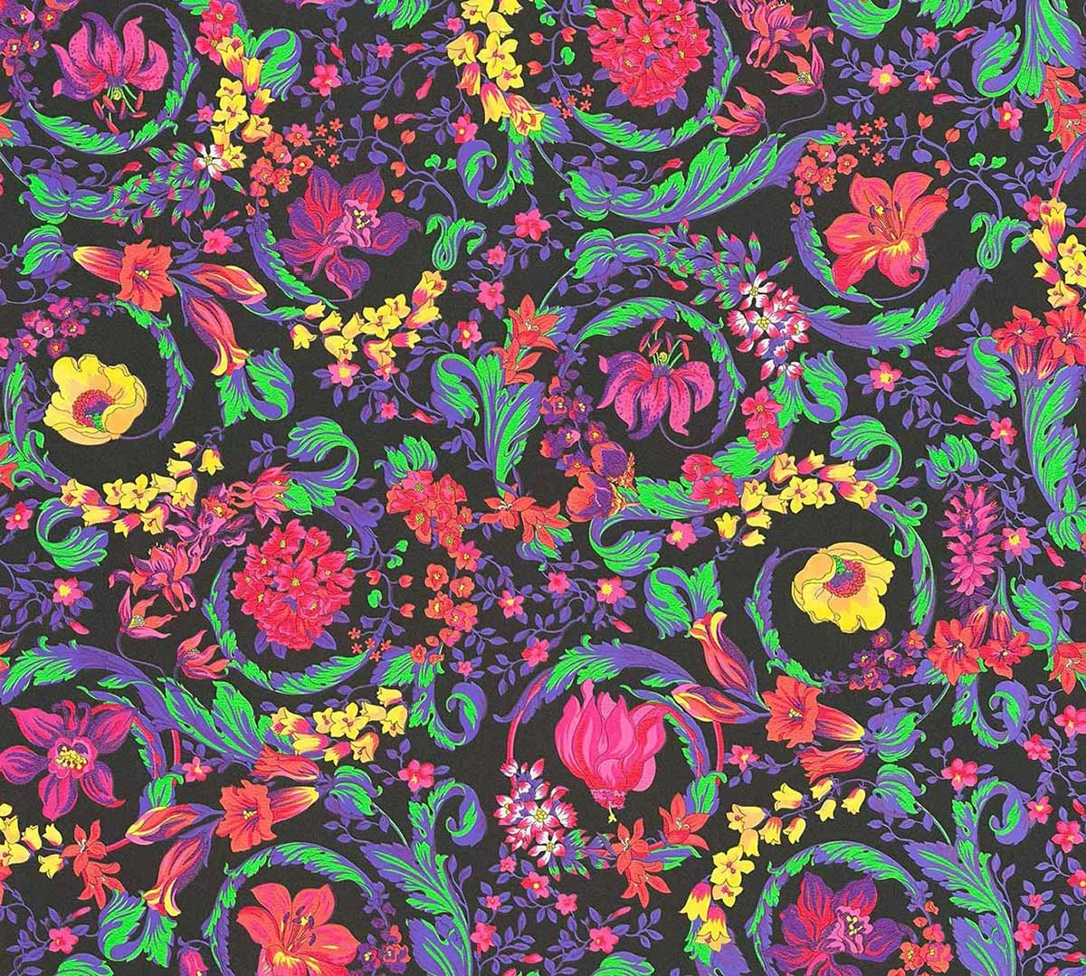 Mit den Vliestapeten der Versace Home 5 Kollektion bringen Sie den einzigartigen Stil der Luxusmarke Versace an Ihre Wände. Die Tapeten zeigen typische Versace Motive wie Medusaköpfe oder Mäandermuster. Aber auch schlichte Uni-Tapeten können Sie hier finden. Die Tapete 38706-1 in Schwarz, Pink-, Gelb-, Grün- und Lilatönen, mit Glitzer, besticht durch ein edles Blumenmuster. Lassen Sie sich von den Versace Home Tapeten überzeugen und entdecken Sie die komplette Kollektion bei uns im Shop.